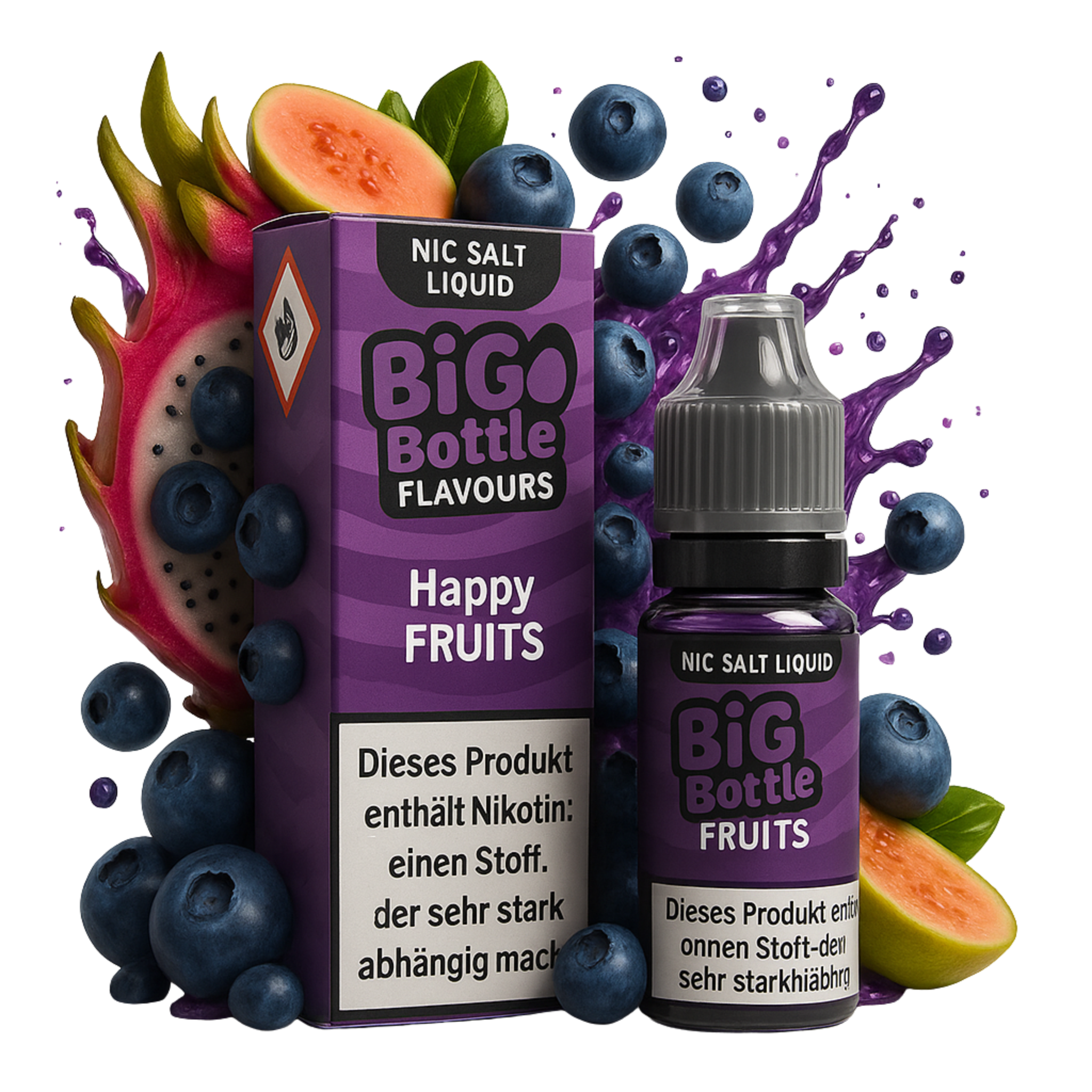 Sie erhalten eine 10 ml Flasche Big Bottle - Happy Fruits - Nikotinsalz Liquid in der gewählten Nikotinstärke.