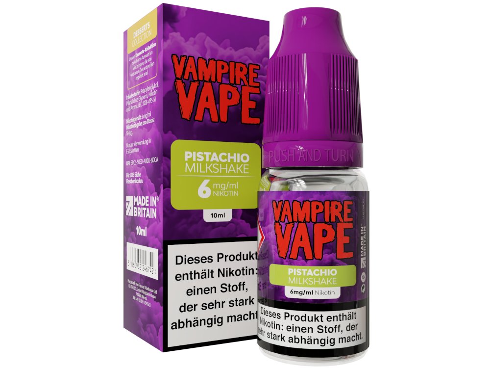 Sie erhalten eine 10 ml Flasche des Vampire Vape Dessert Collection Pistachio Milkshake Liquids in der gewählten Nikotinstärke.
